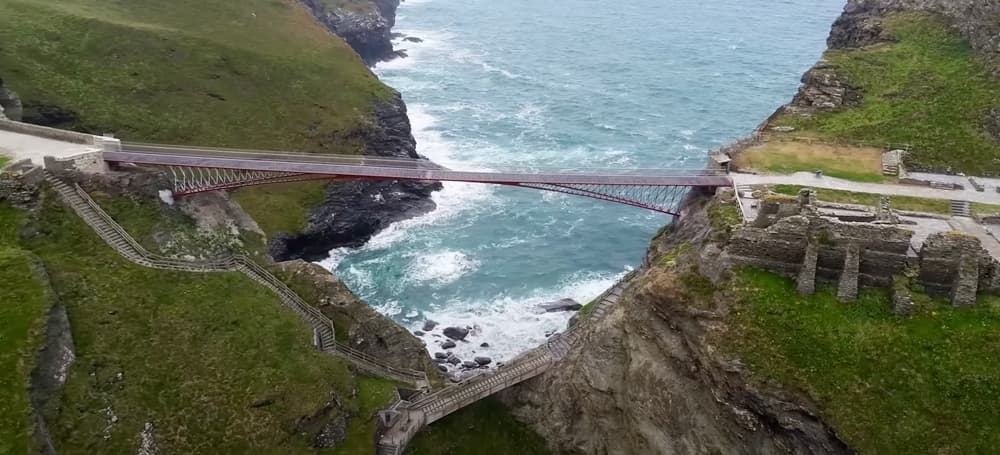 The Tintagel footbridge is located on Cornwall’s north coast. It spans a rocky chasm that was left by the collapse of a natural land bridge between the mainland and a rocky outcrop of historical significance. According to English Heritage, the land bridge collapsed some time between the 14th and 17th century. You can read more about the bridge replacement project on the English Heritage website. Wikipedia also has a good article on the history of the site.