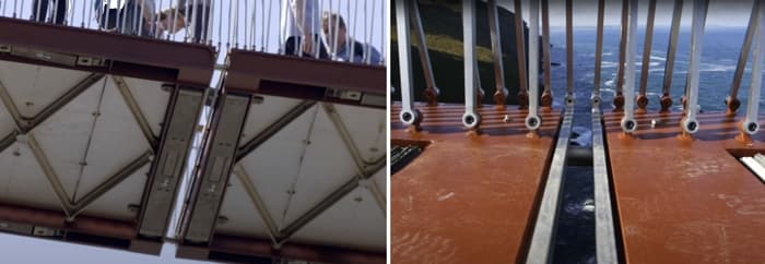 At the mid-span, there is a 40 mm gap in the deck. This has some symbolic significance in the context of the site and is a nice feature that adds a little drama for visitors crossing the bridge. There are many examples in the media of the bridge being described as two independent cantilevers. This is interesting, however there are two round steel bars that span across the gap. If considered as two separate bridges, a more accurate description may be propped cantilever or a pair of mutually propped cantilevers; although I can see the nuance being lost on a non-technical audience. Having said that, the connecting bars a very slim, it may well be that modelling each half of the bridge as a cantilever structure is reasonably accurate. For the purposes of structural modelling, we’re likely to model this connection at the mid-span as a rotational pin allowing transmission of shear and axial forces. Clearly bending won’t be transmitted through this joint.
